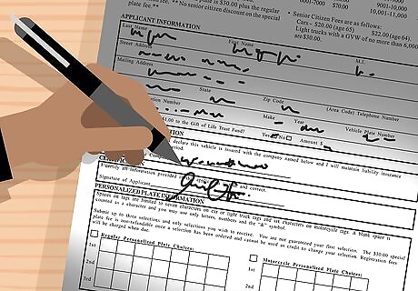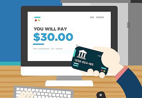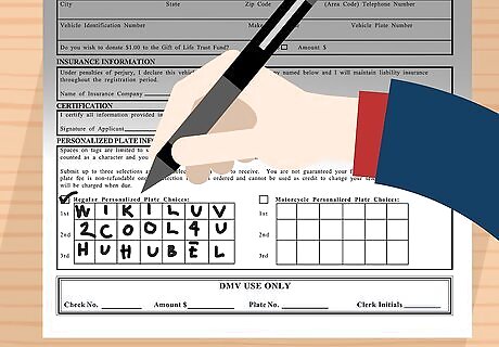 Pay the license plate fees with a credit card. The fee you need to pay depends on the license you’re looking to get. Many of the plates have a standard $30.00 fee in addition to registration fees, while others cost $70.00. There are a variety of plates available, some specifically for members of the Armed Forces and universities, while others are purely cosmetic. Registration fees vary depending on the vehicle.