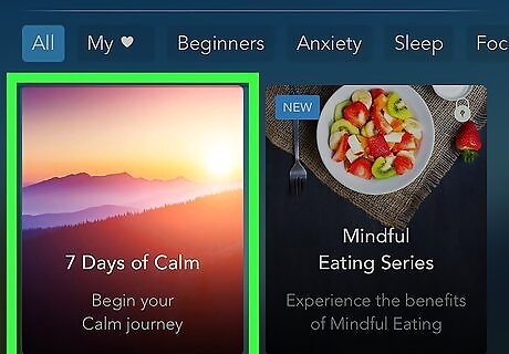 Use 7 Days of Calm to learn how to meditate. This feature is available to you regardless of whether you’ve paid for a subscription. This group of 10-minute meditations teaches you about mindfulness over the course of one week. Here’s how to use it: Tap Meditate at the bottom of the screen. Tap 7 Days of Calm. It’s the first option in the list. Tap the large blue play button to play the first 10-minute meditation. When the meditation ends, you’ll see a message letting you know that you’ve completed the first day of your week-long journey. Tap the X at the top-right corner of the screen to open your profile, and then again to return to the Meditate screen. When you’re ready for the next day’s meditation, return to 7 Days of Calm, then tap the play button.