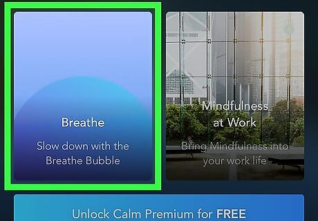Use the Breathe Bubble. This is a free breathing exercise available to all users, including those without subscriptions. Here’s how to use it: Tap Meditate at the bottom-center part of the screen. Tap Breathe. A timer will appear, as will your first instruction (″breathe in″). Inhale and exhale along with the on-screen instructions. You can use this relaxation technique as often as you wish.