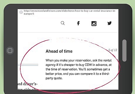 Purchase the insurance when you make your reservation. You’ll most likely save money by purchasing the insurance when you make the reservation rather than when you’re at the counter. Not only is the price higher at the counter, it’s easier for the agents to talk you into coverage you don’t need. You’re probably tired, there may be a language barrier, bargaining customs may be more high-pressure, and the terminology may be different.