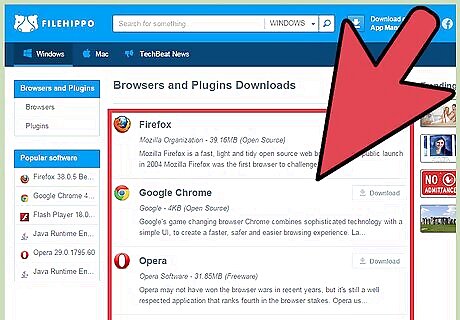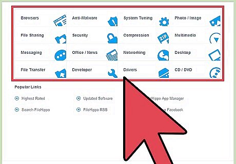Visit the FileHippo website. The homepage shows many links that you can use to download software for free. Here are some of the categories that you can go to in order to find what you are looking for. Browsers and Plugins: includes links to Firefox, Opera, Internet Explorer and Google Chrome browser downloads and plugins. File Sharing: you can find peer-to-peer (P2P) programs such as LimeWire, uTorrent and Vuze under this category. Messaging and Chat: this category is for AIM, Google Talk, Skype, Windows Live Messenger, Yahoo Messenger and other chat software. Anti-Malware: protect your computer by downloading Ad-Aware, AVG, Windows Defender and other anti-malware programs for free. Compression and Backup: save disk space by download programs such as WinRAR, 7-Zip or WinRAR. Audio and Video: download iTunes, QuickTime, Real Player, Winamp, VLC and other media players.