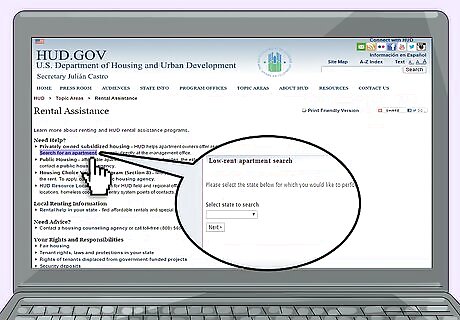 Look for subsidized housing. On the HUD site, you'll find a link for privately-owned, subsidized housing. Once you click on this link, the process for finding low-rent housing is simple. Choose what state you live in. Enter your city, county, or zip code. Specify the type of apartment and number of bedrooms you want. You'll then get a list of government-subsidized apartments in or near your area.