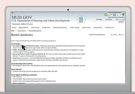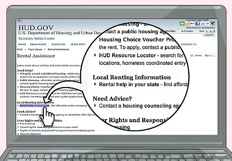 See if your state or local government offers rent assistance. In addition to federally-funded housing, the HUD site will also link you to programs your state and local governments may offer. If you can't find a federal program to take care of your housing needs, you can try your local governments. Click this link to find a list of the states. Click on your state and you'll be brought to the HUD page for your state. On the state HUD page, there will be options for what you're looking for. The two links that will probably be most helpful for you are "Get Rental Help" and "Subsidized Apartment Search."
