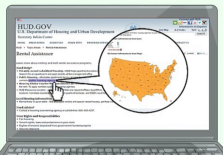 Find a public housing program. The HUD site will also link you to publicly-funded housing in your area. After clicking on this link, you can find public housing close to you. Click on your state on the map. Scroll down the list to find your town or city. When you find your town, you'll see phone numbers of public housing programs in your area. Use these to contact programs and find affordable housing.
