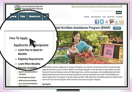 Apply for the Supplemental Nutrition Assistance Program (SNAP). SNAP is designed to help low-income families buy good-quality food. The program is more commonly known as "Food Stamps," although the old stamps are typically not used anymore. If you're approved, you'll receive a card that works like a debit card, and works at approved locations. Follow these steps to apply for the program. Click the page to see if your state accepts online SNAP applications. If so, fill out the application and submit it online. If your state doesn't accept online application, click here to find where the nearest SNAP office is in your state. Go there in person to fill out the paperwork. After you submit your paperwork, the SNAP office may want to interview you. Schedule this right away so you can get your benefits as soon as possible. Make sure you ask the SNAP representative what paperwork you need to bring to your interview. They will often need things like government identification, social security numbers, and bank information.