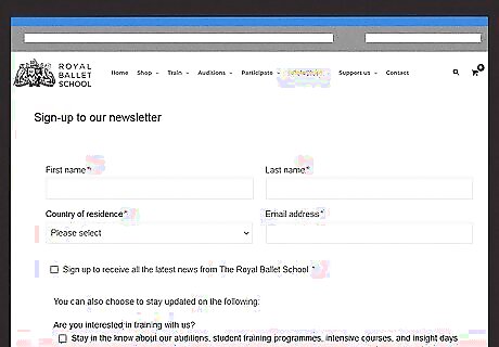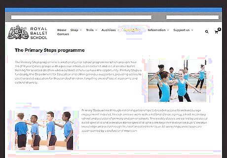 Take advantage of the Royal Ballet School’s Primary Steps program. For children between the ages of seven and eleven, the Royal Ballet offers a junior school program meant to get you started on your path to success. The program is free, and it provides training from professionals in the field. At the end of the training program, you will be invited to watch a session of Royal Ballet School students. Find a local school that offers it. Right now, only 27 schools provide access to the program. These are located in Blackpool, Mansfield Woodhouse, Bury St Edmunds, Swindon, and Dagenham. Contact Arts Award. If you are not in one of the areas currently being serviced, you can request information about how to get involved in programs in your area.