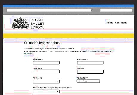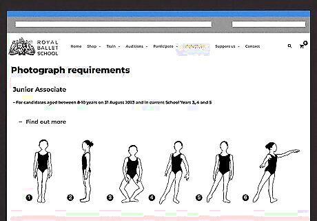 Schedule a photo session. There are specific requirements of which poses must be displayed, and those vary by age and program being applied for. Review the website to find out what you need to do. The school will use the technical facility shown in the photos as part of their admission criteria.