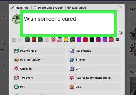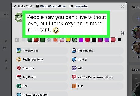 Post on Facebook often. You don't have to treat Facebook like your personal diary—even just posting once per day is enough to keep your Timeline filled with content. When posting, try to come up with unique, engaging content that makes your friends laugh (or cry, as the case may be). Posting more than two or three times per day can cause people to begin avoiding your content due to oversaturation, so don't post too often.