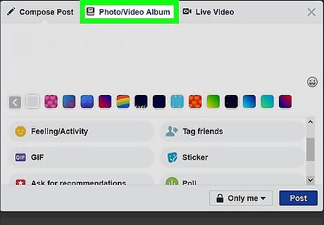 Upload photos and videos. While text-only posts have their place on Facebook, many people respond best to visual media like photos and videos. If you have an interesting item to share (e.g., a photo of an animal or a hike, or a video of the same), consider uploading it. Always include text along with the photo or video. It may be tempting to upload several photos at once, but try uploading one at a time to start. This will give people a chance to view and like the photo without having to navigate through an entire album.