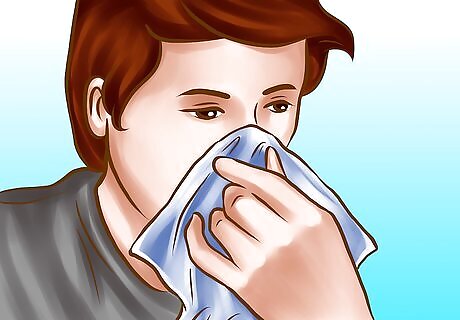 Blow your nose often to relieve congestion. Blow gently so that you don't irritate your sinuses or disturb your inner ear--hard blowing could cause nosebleeds and ear infections. Try holding one nostril shut and blowing out of the other, then switching nostrils. Blow your nose into your hands during a hot shower, and let the water wash away any mucus. This is a great way to completely--if temporarily--clear your sinuses. Consider using a fresh roll of toilet paper as a cheap alternative to tissues. Keep the roll near you in case you need to wipe your nose, blow your nose, or sneeze. To help stop the spread of germs, cover your mouth and nose with a tissue when you cough or sneeze and throw it in the trash immediately. If you don't have a tissue handy sneeze or cough into your elbow, not your hands! Remember to wash your hands with soap afterwards as well!