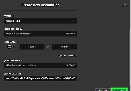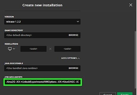 Ensure it says "-Xmx2G" or more in "JVM Arguments". The first argument in the "JVM Arguments" field indicates how much RAM the Minecraft installation uses. You need at least 2 GM of RAM. If the first part of the JVM arguments says "-Xmx1G" by default, change it so it says "-Xmx2G" or more.