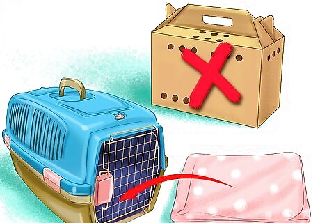 Obtain a rabbit carrier. Your vet will not come to you. Therefore, it is important to find a carrier in which you can safely and securely transport your bunny to and from the vet. A good carrier will have a gated opening on both the front and side. The carrier should offer some room for your bunny to move around, but should not be too big. When turned sideways in the carrier, your bunny's front and back legs should be able to touch the sides. Place a warm blanket or towel in the bottom of the carrier so your bunny can stay warm after the surgery. Drive slowly and carefully when your rabbit is in the car. Handling your rabbit gently is especially important when bringing it home from the operation, since moving too roughly with it could cause pain and loosen its stitches. Do not use cardboard boxes or containers of nylon or cloth to transport your bunny. Your bunny might chew through these materials.