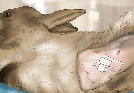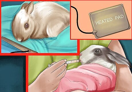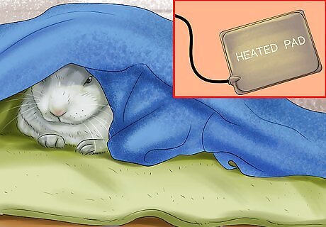 Prevent against hypothermia. Hypothermia is a rapid decline in body temperature, and is usually associated with exposure to cold temperatures over a prolonged period. But hypothermia is not uncommon in rabbits when they get surgery because their small bodies do not retain as much heat as a larger animal. Most vets provide a heating pad beneath the rabbit during surgery, and in an incubator when it stays overnight at the clinic for recovery. Once you bring the rabbit home, provide warm blankets (putting them through a tumble in the dryer first is a good idea) and check your rabbit’s body temperature. If you touch your bunny’s belly and it feels cool, turn up the ambient temperature. Consider putting a heating pad in or near one portion of the cage so your bunny can get warmer.