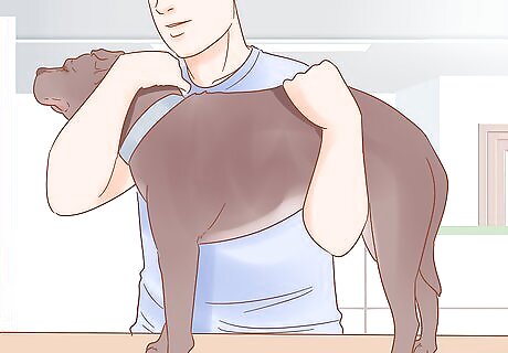 Restrain your pet. This can be done in a variety of ways and depending on the size of your pet, you may need another set of hands. Start by cornering in its hind legs. Your pet will most likely try to back out of whatever situation they are in. If they cannot, they’ll be easier to contain. Hold its head with one hand and have the other prepared to administer the medicine. If you are using an oral medication, place your pointer finger and thumb on either side of your pet's mouth and tilt its head backwards. This is the most effective way to get your pet’s mouth open to receive the medication.