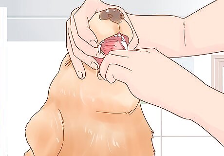 Apply or insert the medicine. Now that you have your pet restrained, administer the medicine. Apply topical treatments according to the directions — most of the time on the back of your pet's head/neck, so it cannot mess with it once it has been applied. Insert the pill into the cat’s/dog’s mouth. For oral medicines, you’ll want to close your pet’s mouth. Hold it closed for 5-10 seconds and rub the outside of its throat gently. This will spark the swallowing process. Afterwards, make sure that the oral supplement has been swallowed. Dogs and cats will often spit it right back out.