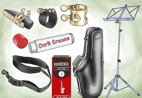 Buy the accessories you'll need to play. Other accessories that you'll need are a hard saxophone case, neck strap, extra reeds, cork grease, and music stand. The neck strap supports your horn and keeps it close to your body as you play. Reeds are necessary and can break easily, so it's a good idea to pick up extras. Cork grease is used to help move your mouthpiece on your sax, which will affect its pitch. Finally, the music stand enables you to sit sheet music upright, which is critical when playing a song. Music stores will often offer a beginner saxophone with all the accessories included. Ask the salesperson if they offer these types of packages.