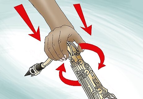Slide the ligature over the reed. Handle the ligature with care and make sure not to damage the tip of your reed. Slide the ligature over the reed and position it towards the bottom of the reed. Tighten the screws to hold the reed in place. Once you have the reed attached, you should twist the mouthpiece so the reed is facing downwards.