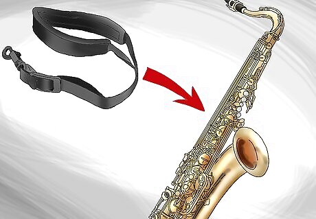 Attach the body of your sax to your neck strap. Take the body of the saxophone and thread your neck strap through the hook on the back of the saxophone. You should hold the saxophone on the bottom with your dominant hand to keep it in place as you do this.