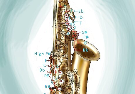 Learn the different notes on the saxophone. Notes on a saxophone are comprised of open and closed keys that are performed by holding down buttons on your instrument. If you want to read off sheet music or play with a band, it's important that you study and memorize a key chart, so you know which buttons to hold down. A C note is played by holding down the large middle button on the top of your saxophone.