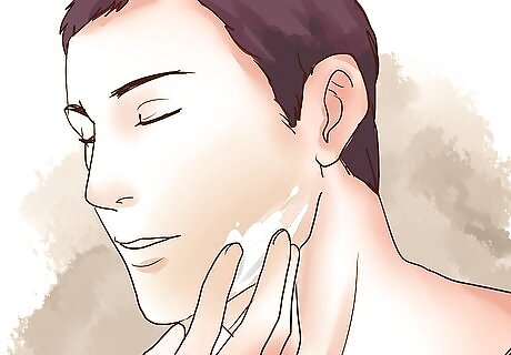 Err on the side of cooler water when bathing. Piping hot showers can feel great on cold mornings, but if you can stand it, try to turn the temperature down to mildly warm. Hot water can strip your skin of its vital oils, leaving your skin delicate and dried-out. If you have stubble (particularly thick stubble), this can be especially bad, as it can give you a condition a little like "facial dandruff" where tiny flakes of skin fall off of your face when you rub your stubble. A moisturizing lotion can help with dry skin underneath your stubble. Try applying it once in the morning and once before you go to bed for lasting softness and smoothness.