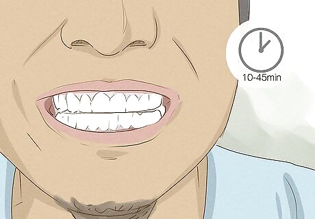 Keep the strips attached for 10-45 minutes. The exact amount of time depends on how strong the whitening gel is, so leave them on for as long as the product instructs you to. While you wait, try lying back with your mouth slightly open so pull saliva away from your teeth. Try to reduce the amount of times you swallow while the strips are attached. You might swallow some of the whitening chemicals, which could irritate your stomach. Don’t eat or drink while the strips are attached. Leave them in place and don’t touch or adjust them.