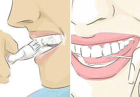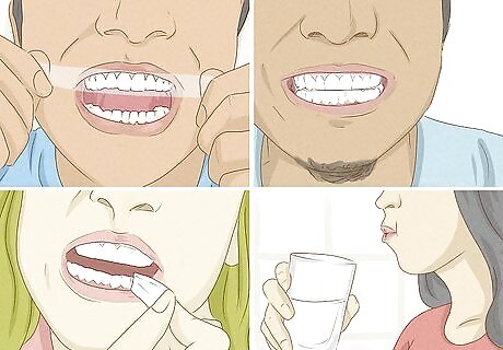 Gargle with mouthwash to prevent stains from leftover bacteria. Brushing doesn’t remove all the bacteria in your mouth. After you brush, rinse your mouth for another minute using an ADA-approved mouthwash to prevent plaque from building up and staining your teeth. Remember to look for the ADA seal on any mouthwash products you use. If the mouthwash is too strong or minty and burns your gums, dilute it with an equal amount of water.