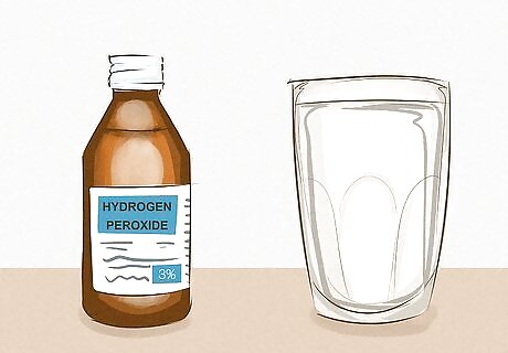 Rinse your mouth with a 1.5%-3% hydrogen peroxide solution. Many whitening products contain peroxide, and a low-concentration mixture can help whiten your teeth more cheaply. Pour the peroxide into a cup and dilute it with an equal amount of water. Then put some in your mouth after brushing and swish it around for 1-2 minutes. Spit it out and rinse your mouth with plain water. Don’t swallow this mixture. It could irritate your stomach. Most pharmacies and drug stores carry peroxide. Make sure to get a low concentration to avoid irritating your mouth. You can also mix baking soda with peroxide instead of water to make a whitening toothpaste. Keep in mind that this mixture won’t taste very good, so dilute it with water if you find the flavor overwhelming.