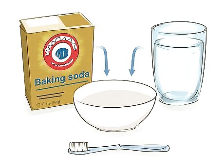 Brush your teeth with baking soda for a cheaper option. Whitening products can be expensive, and a simpler and more affordable option is using plain baking soda. Put a small spoonful of baking soda into a cup and add a few drops of water. Mix them together until the baking soda reaches a pasty consistency. Then dip your toothbrush in and brush your teeth normally. Rinse your mouth thoroughly with water or mouthwash after using baking soda. Leaving it on your teeth could cause irritation or erode the enamel. You can also add baking soda to your regular toothpaste for a similar effect. Squeeze the normal amount on to your toothbrush and sprinkle some baking soda onto it before brushing. Explore more at-home fixes for yellow teeth in our "How can I whiten my teeth at home? Looking for DIY tips" forum.