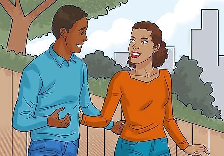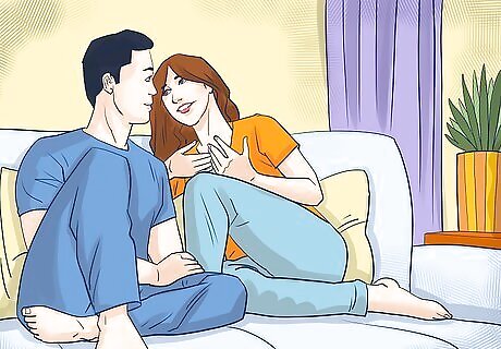 Decide whether or not to face your guy. Men seem to prefer a side-by-side conversation position, such as standing or sitting next to each other. Therefore, it might be helpful to initiate a conversation during a walk with your guy, or while you are doing chores side-by-side. However, if your eyes are diverted, your partner may think that you are distracted by whatever you are looking at and not fully focusing on what he is saying. Therefore, in some situations, it might be best to face your guy, such as when you have something important that you need to discuss with him. If you decide to face your body towards your guy, try to find a natural balance in your eye contact, too much and not enough blinking may make him nervous. When you are the one talking, making eye contact about 1/3 of the time. When your guy is talking to you, you want to increase the eye contact to about 2/3 of the time. For regular conversation, or if you find that eye contact makes you nervous, try 3 to 4 second spurts of eye contact.