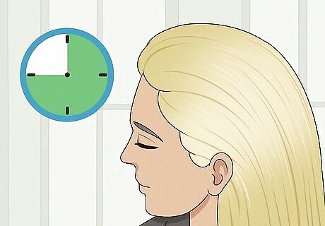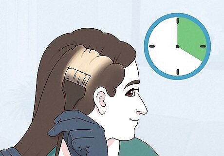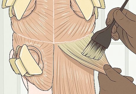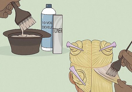 Mix your toner with 10-volume developer and apply it to your hair. You will apply the toner in the same way you did the bleach, so divide your hair into 4 sections and clip them up. Repeat the same application process, starting at the crown of one section and working your way down. Repeat the same process when applying the toner to the remaining 3 sections. Apply the toner as quickly as you can for best results.