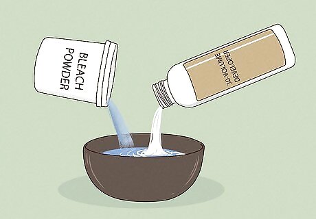 Mix your bleach powder with 30-volume developer. The ratio of bleach powder to developer is usually 1:1, but check your product's instructions for any variance or specifics. Dump 1 scoop of bleach powder into a mixing bowl. Measure out 1 scoop of developer and add it to the bowl. Mix well. Start with this amount of mixture. You can mix more as you go along, if needed. If possible, use salon-grade bleaching powder for best results. Bleach is a dangerous substance, so wear plastic gloves for this entire process. Purchased bleach products usually provide them for you.