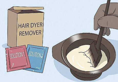 Open the stripping product and mix the 2 solutions together. After you open the box, you'll find 2 small packets. Put on a pair of plastic gloves and mix the content of the 2 packets together. Be prepared to apply the mixture immediately after mixing it for full potency. The ingredients in these packets are non-toxic, so if you accidentally get a little on your skin, it won't harm you. If you are allergic or sensitive to sulfur, you should not use hair dye remover. Sulfur is one of the ingredients.