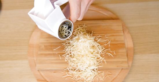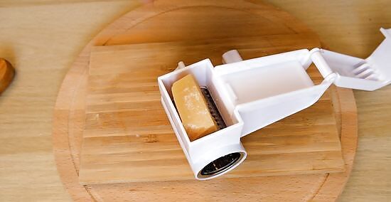 Turn the handle with your other hand while aiming the grating compartment at a nearby plate or bowl. Stop whenever you feel like you have enough shredded cheese.