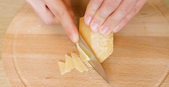 Use a sharp kitchen knife to thinly slice cheese. Though this is more time consuming, a knife is a nice substitute for a vegetable peeler. Hold a small chunk of cheese against the surface of a plate. Gently slice off thin shreds onto the plate. Opt for a plain edge rather than a serrated edge. Plain edge knives are better at shaving and skinning. Avoid holding large blocks of cheese. Since knife work is more dangerous than other grating options, you want to have a steady and firm grip on the cheese.