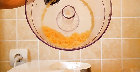 Mince cheese with a food processor. For quick and easy shredded cheese, a food processor is the optimal choice. Refrigerate your cheese until it is firm but not too hard. Chop it into smaller blocks and place it in your food processor. Be cautious about overloading your processor. Some food processor blades have seized up or become unbalanced when grating cheese. Turn the food processor on and monitor the shape of the cheese shreds. Once you have shredded the cheese to your liking, turn off the processor and empty it onto a plate. If your processor has a shredding disk, select this blade as it will provide better quality slices. Avoid processing softer cheeses such as Mozzarella. This will result in smeared, not shredded, cheese.