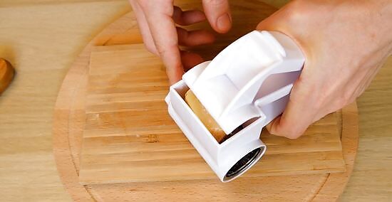 Slice your cheese using a rotary grater. A rotary grater consists of a handle connected to a circular grating compartment. A side crank is then rotated to grate the cheese. Raise the top handle of the grater, place a small block of cheese into the compartment, and lower the handle.
