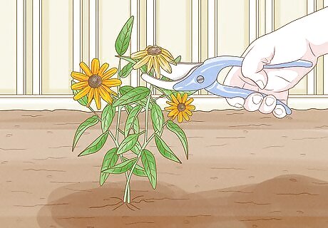 Remove dead flowers. Remove the flowers as they begin to fade to encourage the plants to produce more flowers or, if more Black Eyed Susan plants are desired, leave a few of the flowers on the stems to go to seed. Trim all of the stems right down to the ground in late winter to make room for fresh growth in the spring.