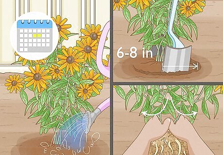 Divide Black Eyed Susan plants every three years. This dividing should be done in March. Prepare the planting site before digging them up if the divisions are to be replanted. Water the plants one to two days before digging them up. To dig your plants up and divide them: Push a dirt shovel into the soil all the way around the plants 6 to 8 inches (15.2 to 20.3 cm) away from the stems to sever the roots. Push the dirt shovel into the soil again and lift the whole clump up with the tip of the shovel. Carefully work the plants apart, being sure to leave a good fist-full of roots and three to five healthy stems on each division. Replant them right away or pot them up in soil-based potting soil to give away to neighbors, friends and family.