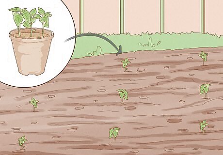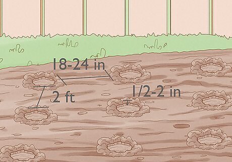 Dig holes 18 to 24 inches (45.7 to 61.0 cm) apart in the garden. The holes should be large enough to accommodate the plants and their root balls, about 1 ⁄2 to 2 inches (3.8 to 5.1 cm) deep and wide. If you're planting multiple rows, make sure they're two feet apart.