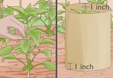 Monitor the plants for pests. Pepper plants are susceptible to aphids and flea beetles. If you see pests on your plants, pick them off and drop them in a pail of soapy water. You can also spray them off using a strong stream from your garden hose. As a last resort, spray your plants with pesticides, making sure they're safe for use on vegetables. If you're dealing with a big pest problem, you can cuff the plants. Arrange a piece of cardboard in a circular fashion around the stem of each plant. Make sure the cardboard sticks into the soil about an inch deep, and rises up several inches. This will prevent insects from climbing up the stems.