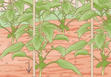 Stake the plants if they get heavy. Place a garden stake next to the main stem and fasten the stem to it loosely with twine. This will help the plant grow upright and keep the peppers from growing against the ground.