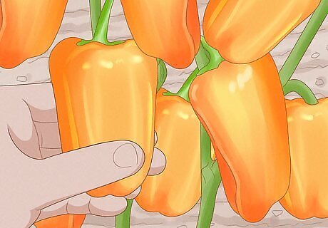 Pull or cut the peppers off when they mature. The peppers are ready to cut when they're bright and color and look fully ripe. When the peppers have reached the correct shape, color and size, harvest them by cutting them off with a knife. The plant will now be free to produce new fruit.