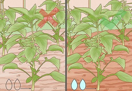 Keep the soil moist. Pepper plants like heat, but they need moist soil. Water your sweet pepper plants several times a week throughout the summer. Daily watering may be necessary during particularly dry, hot spells. You can help keep the soil moist by mulching it with grass clippings. Water near the roots, rather than showering the water from overhead. This prevents the leaves from getting burned by the sun. Water in the morning, rather than at night. This way the water will be absorbed during the day. Watering at night leaves the plants prone to mold growth.