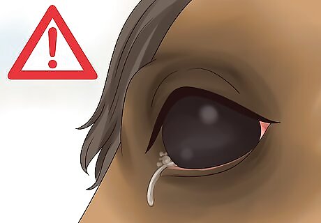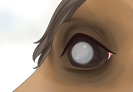Recognize signs of moon blindness. You will see most symptoms of moon blindness in your horse's eyes. Look for inflammation around your horse’s eye, excessive blinking, and/or rubbing your horse rubbing their eyes against other surfaces. If you see these, check for additional symptoms including: Redness in the eye Cloudiness in the eye Swelling around the eyelid Tears Squinting Other changes in eye appearance