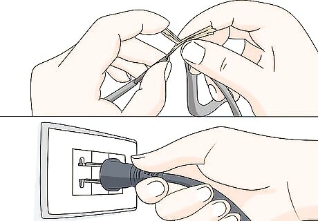Hook the wires to the lights to illuminate them. When the lights are fully attached, it’s safe to connect them. Take the wires that came with the lights and make sure they’re unplugged. Hold one wire parallel with the electrode coming out of one side of the light, with the ends lined up. Then, twist the metal ends together and place a cap or wire nut over them. Do the same for the other wire and electrode on the light. Plug the wires into the wall and switch them on to admire your handiwork. Check the instructions for the proper way to hook the wires together Do not hook up the lights before they’re attached to the wall. You could shock yourself if you make a mistake. Some lights may come with the wires attached already. In this case, make sure the lights are unplugged while you work.