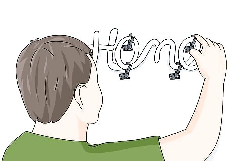 Attach the clips every 6 in (15 cm) along the lights. Before attaching the lights, check the instructions that came with your light set and see if they tell you to place the clips in specific locations and follow those instructions. If not, then work along the light design and attach a clip every 6 in (15 cm). Gently press the clips onto the back of the lights until they snap into place. Adjust the clips so they'll sit flat against the wall. Be very careful when attaching the clips. The lights are thin and could break if you press down too hard. Some lights may already have the clips attached. If the lights came pre-mounted to a backboard, you don’t have to attach any clips to the lights.