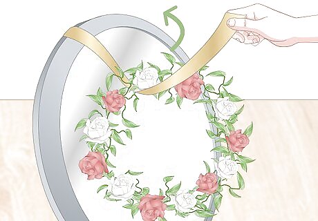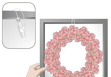 Hang the mirror using a loop of lightweight fishing line. Purchase a small spool of 3–4 lb (1.4–1.8 kg) fishing line from a hardware store. Use a pair of scissors to cut a 1–2 ft (0.30–0.61 m) section of line. Stick 1 end of the line through the wreath and tie the 2 ends in a knot. Loop the tied line over the push pin or suction cup at the top of your mirror. The fishing line will be practically invisible to any guests who visit your home and look at the wreath.