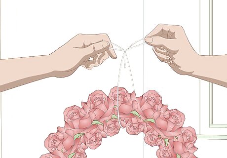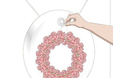 Loop a piece of fishing line to the wreath and tie the ends together. Visit your local fishing supply store and purchase some light-weight fishing line that's about 3–4 lb (1.4–1.8 kg). Cut a 2–3 ft (0.61–0.91 m) section of line. Stick 1 end of the segment of fishing line through the hole in the center of the wreath. Then, tie the 2 ends of the fishing line together. You might need a pair of tweezers to do this since fine fishing line is tricky to tie. Using fishing line to suspend the wreath will make it look as if it’s floating in the air, since the line won’t be visible to guests. If you don’t like the look of the wreath floating in midair, you could cut a 1 foot (0.30 m) long piece of narrow ribbon and tie this around the wreath instead of the fishing line.