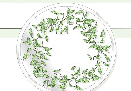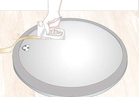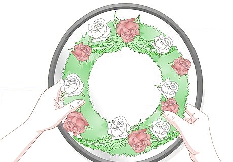 Situate a wreath on a round mirror that’s slightly larger than the wreath. Decorative round mirrors tend not to be very large. If you’d like to hang a wreath over a round mirror, use a smaller wreath so that it doesn’t cover the entire mirror. For example, if your wreath has a 24 in (61 cm) diameter, hang it over a mirror that’s at least 28 in (71 cm) across. Alternately, you can use a round mirror and a wreath as a horizontal decoration. Place the round mirror flat on a coffee table or dining room table, and place the wreath on top of the mirror. Anchor it in place with adhesive felt pads. Set a couple of votive candles in the center to finish the decoration.