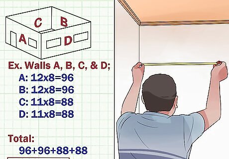 Measure your space. Wall covering retailers can help you calculate how much wallpaper you need, but here's a quick guide to a good calculation. Get a notepad and measure the room's height and width by wall section. For example, two walls 12' wide x 8' high, and two walls 11' wide x 8' high. The math is: 12x8=96, 12x8=96, 11x8=88, 11x8=88. 96+96+88+88 = 368 sq. ft. Now you are thinking to yourself, "what about doors and windows? I must subtract for that, right?" Wrong. A certain amount of "waste" paper is necessary for calculated mistakes, so don't worry about counting out empty spaces.